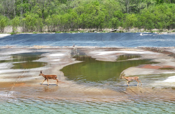 近两年矿山来了许多“新居民”,绿头鸭、黑翅长脚鹬等珍惜水鸟在尾矿库荷花池自由自在地觅食,甚至还有国家二级保护动物白骨顶鸡,野生狍子来到截渗坝区域活动”。