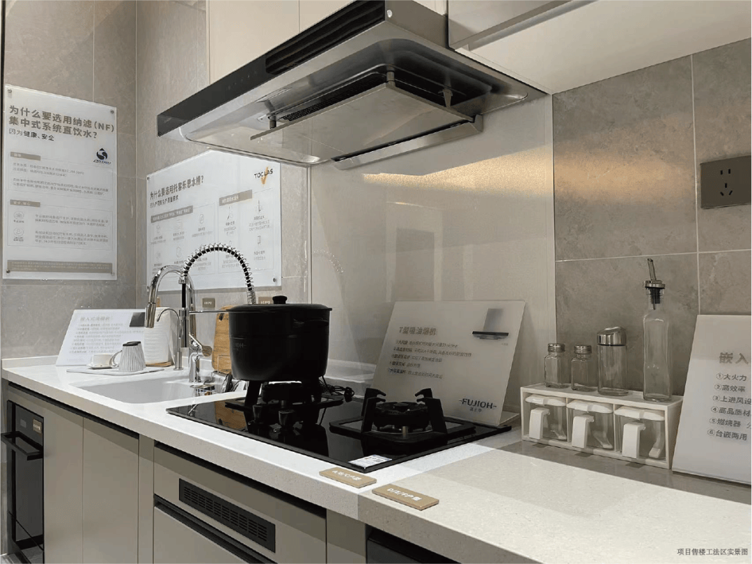 厨房配置:采用无缝拼接的人造石大单槽,搭配托客乐思抽拉龙头,清洁无死角。富士帝烟灶、洗碗机、蒸烤一体机(部分户型)让烹饪成为享受。