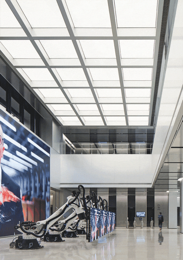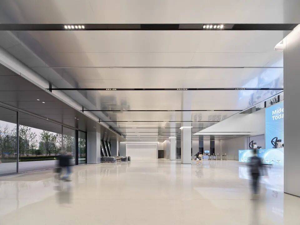 为助力美的集团实现从“传统白色家电企业” 到 “头部科技企业” 的品牌形象升级,杰恩设计在室内设计层面倾注匠心,打造专属品牌气质的空间表达。以大堂区域为例,高挑的空间搭配简练的线条,结合精巧的灯光设计与超大尺寸显示屏,塑造出极具视觉冲击力的科技感空间。材料选用上,采用阳极氧化铝板、人造石、素色岩板与裸顶等材质,兼具优质质感与耐用性,进一步强化空间的科技美学质感。以黑白灰为主的科技感色调,营造出简洁大气、极具现代感的空间氛围。