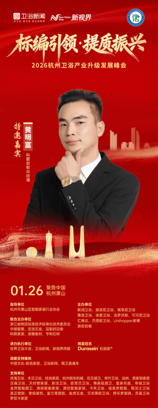 在卫浴产品向高端化、个性化、品质化进阶的当下,核心材质的创新与工艺的精进,成为驱动产区升级、企业突围的关键引擎。岩板作为高端卫浴台面的核心优选材质,正以其耐磨、环保、美观的核心优势,重塑卫浴空间品质标准。1月26日,以“标编引领·提质振兴”为主题的2026杭州卫浴产业升级发展峰会将在萧山盛大启幕,深耕岩板加工领域的行业佼佼者——杭州科箭家居有限公司,将由总经理黄明富带队出席,以匠心品质与专业实力为产区升级注入独特动能,与全行业同仁共探高端卫浴材质创新发展新路径。