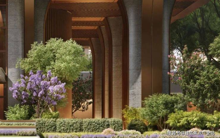 底部以石材和金属结合的曲线异形巨柱抬高建筑体量,构筑了廊柱与动态景观空间,既满足了尊贵的入户大堂需求,又释放了底层空间的潜力,进一步提升了低层住宅的采光效果和视野范围,从而营造出更为宜人的居住环境。