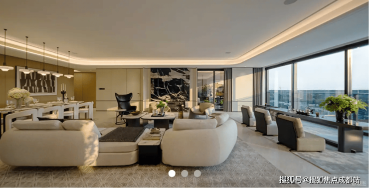 建筑外立面采用90%玻璃幕墙+天然奢石,帆船造型屋顶致敬纽约One57,打造城市地标。园林以《山海经》为蓝本打造30000㎡立体园林,利用12米高差营造层次感。全系奢装标配嘉格纳7-8件套、当代/劳芬等国际品牌,装标达1.2-1.5万元/㎡。