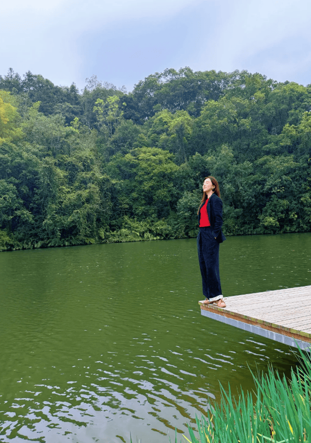 39岁的李思思虽说已经是两个孩子的妈妈,但她身材高挑匀称,长发自然垂落,站在木质栈道上拍照的她,背景是一片宁静的湖水和茂密的绿色树林,营造出一种清新自然的氛围。